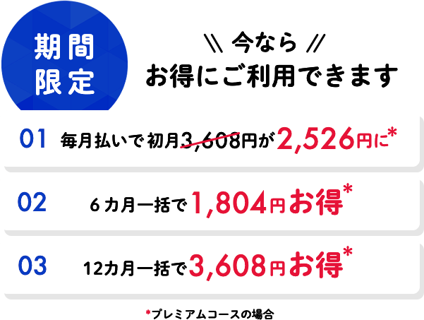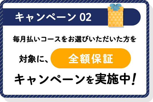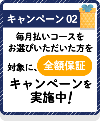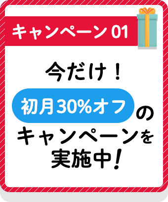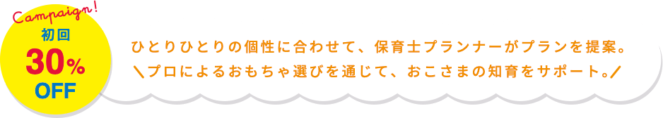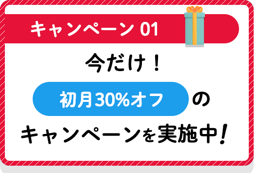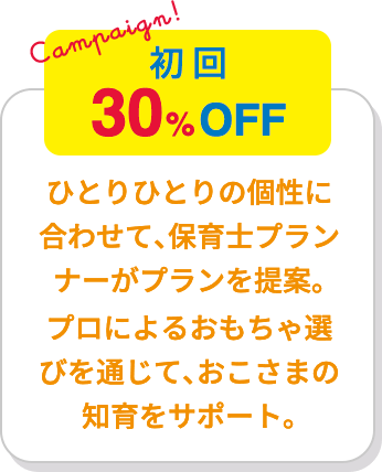 ・ 本キャンペーンは毎月払いコースのみが対象です。 ・ 2か月目以降は30%オフではなく通常料金となります。 ・ お子様が全ての玩具で全く遊ばない場合、 申込後14日以内にご連絡頂ければご返金致します。