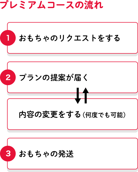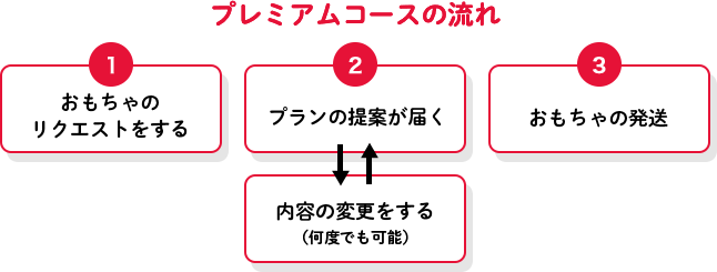 通常プレミアムコースの場合お申込みから3営業日以内にご連絡しプラン提案から発送に進みますが、大型連休の後やメディア露出などの影響でお申込みが集中した際などは7~10営業日ほど日数を頂く場合もございます。あらかじめご了承ください。またプレミアムコースでおもちゃプランのご提案をした際、内容の変更は何度でもお受けできますがこれを繰り返した分だけ発送は遅れてしまいますのでご理解頂きますようお願いいたします。